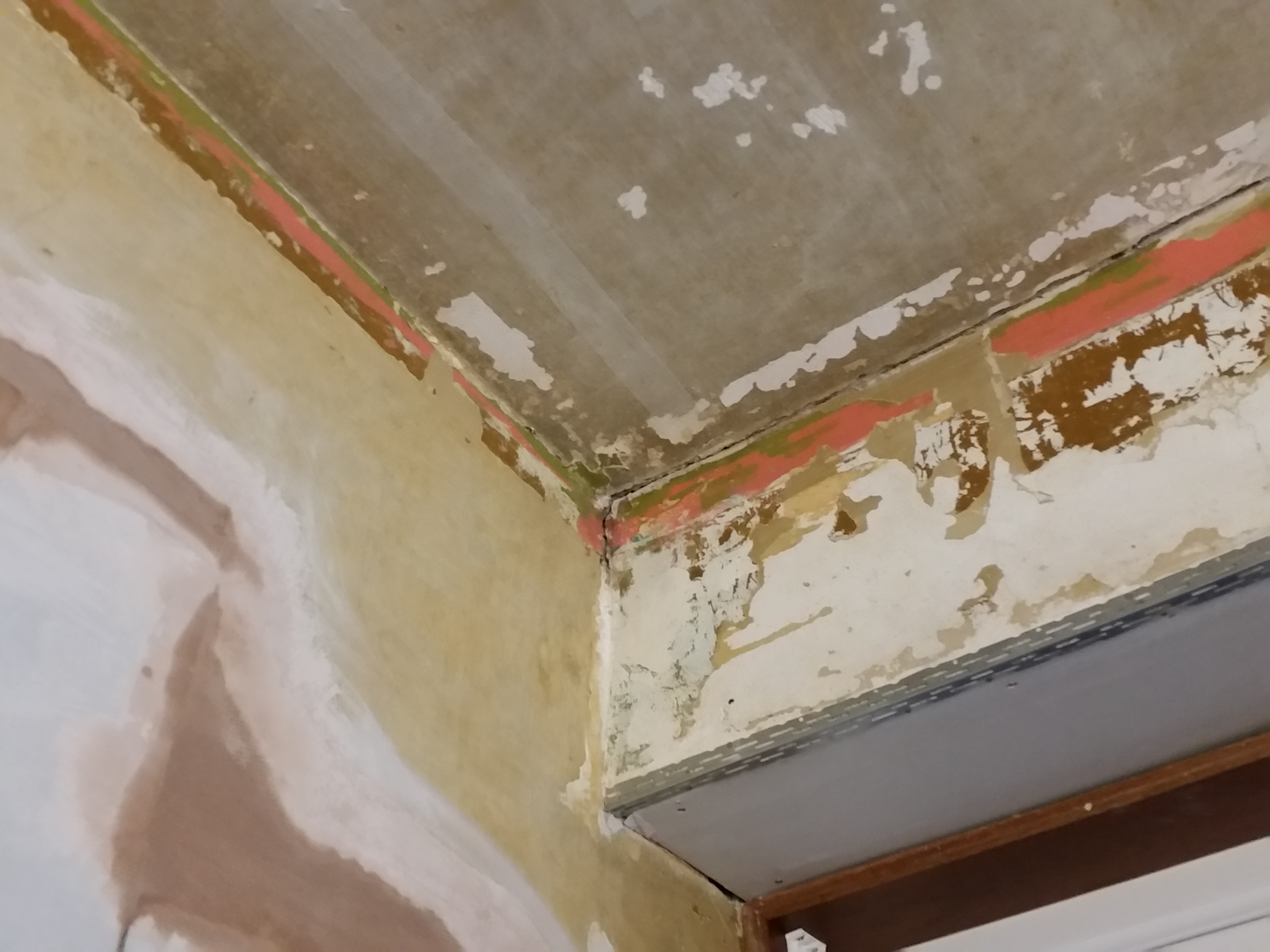Previous ImageNext Image 20180312_182014 Breakfast room – Day 6. Horrible, old polystyrene coving removed and will be replaced by a simple plaster coving.