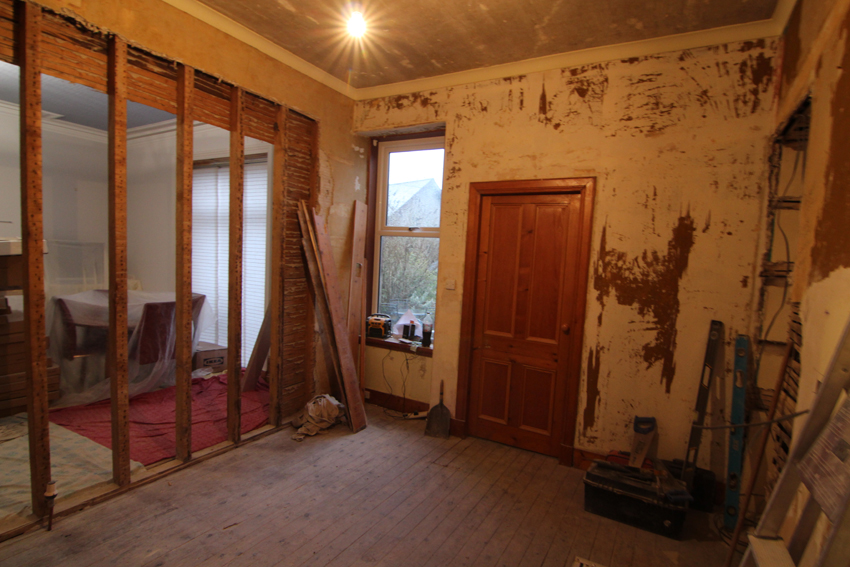 Previous ImageNext Image IMG_2520a Breakfast room – day 1. Walk-through to the back room exposed and the Aberdeen ‘press’ (cupboard to the right) opened up.