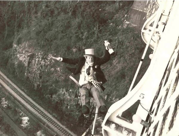 Previous ImageNext Image Kirke Kirke leapt in full morning dress with a bottle of champagne in hand. He was secured to the bungee cord via a climbing harness rather than by lashing the cord round the ankles as subsequent commercial operators jump do